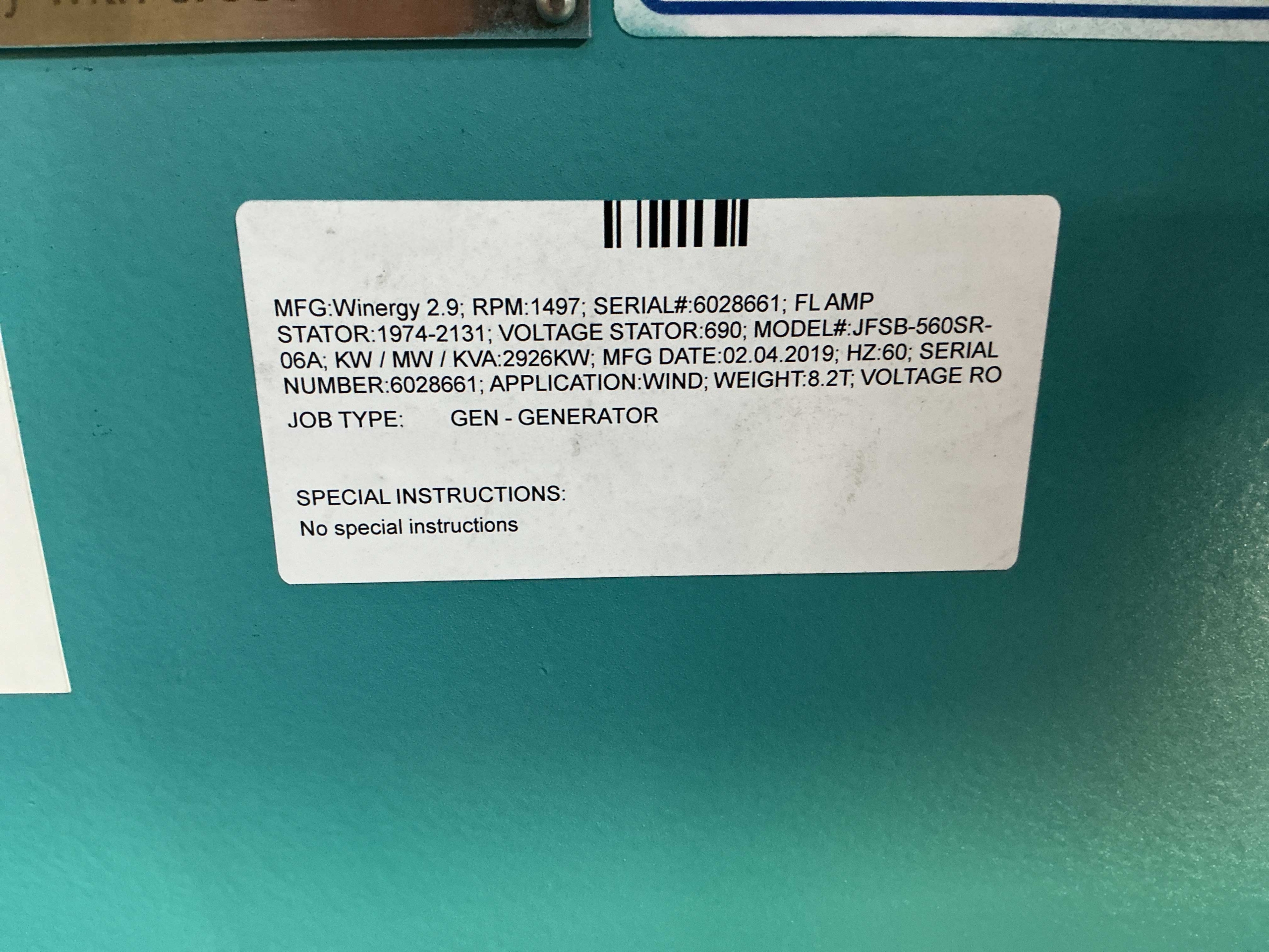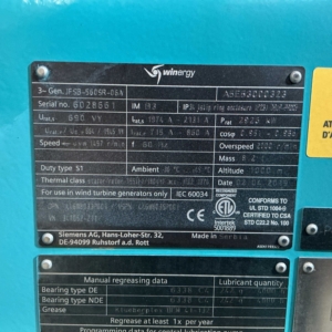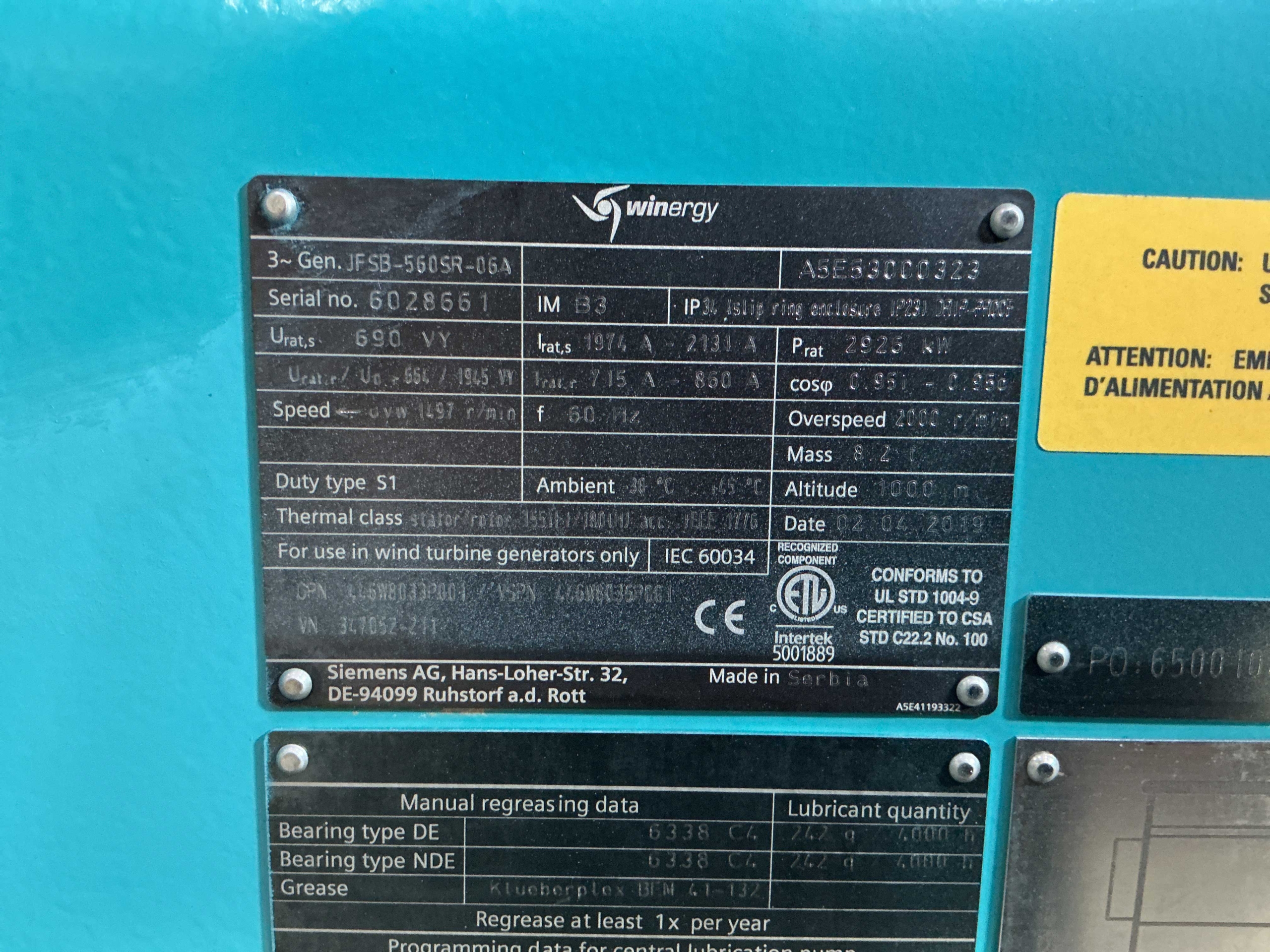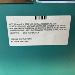 WINERGY 2.9 MW GENERATOR WITH MODEL NUMBER JFSB-560SR-06A